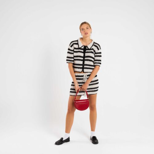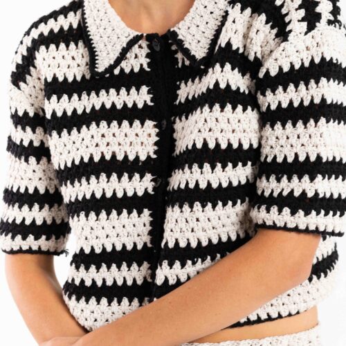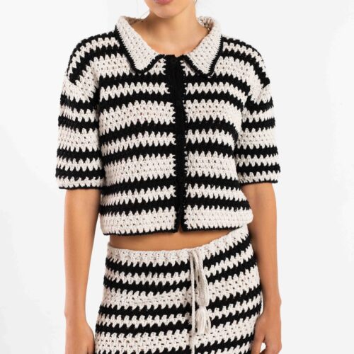 Tejido a mano , en crochette. En punto vareta y punto cadena , a dos colores