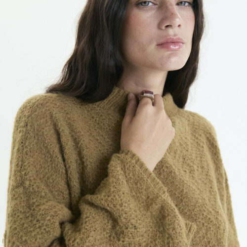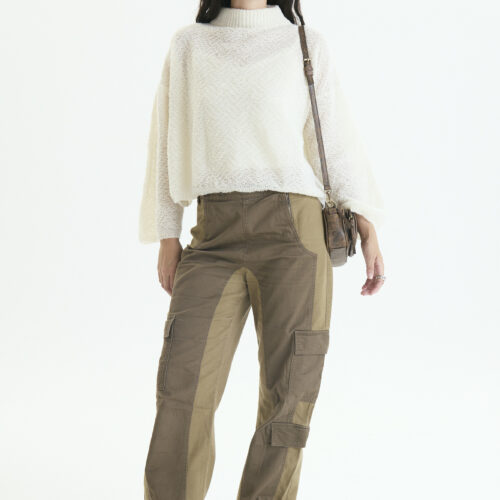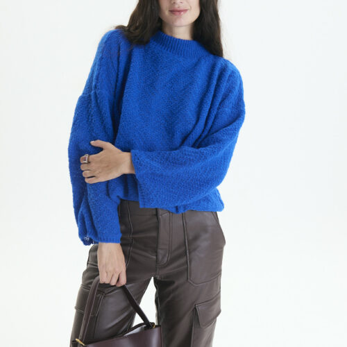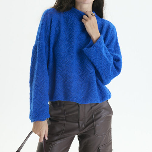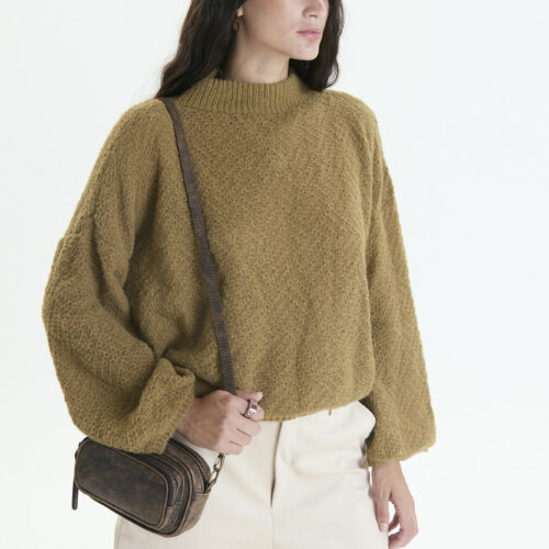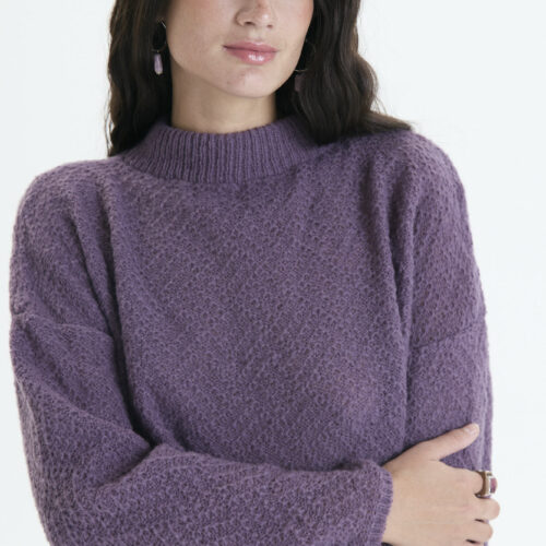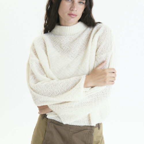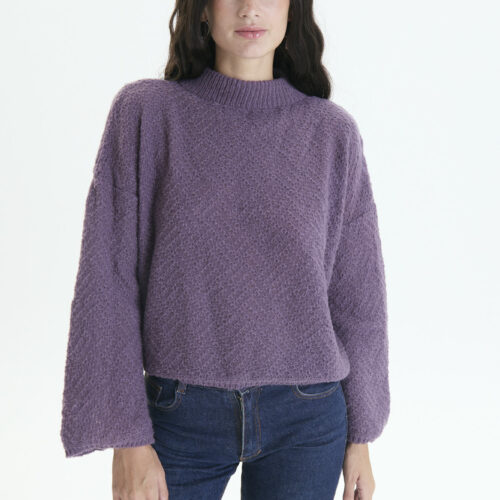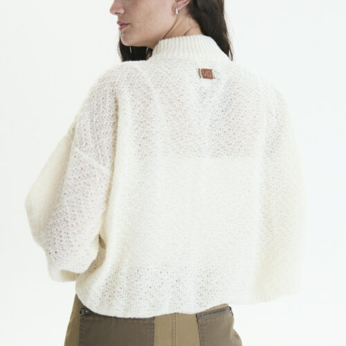 Tejido en forma artesanal , con puntos relieves y cuello en elastico doble . Molderia amplia y manga rectas