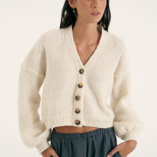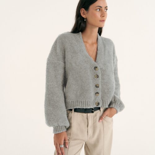 Tejido en forma artesanal , menguando y mangas semi bombe . Escte en V y botones de pasta melange