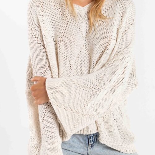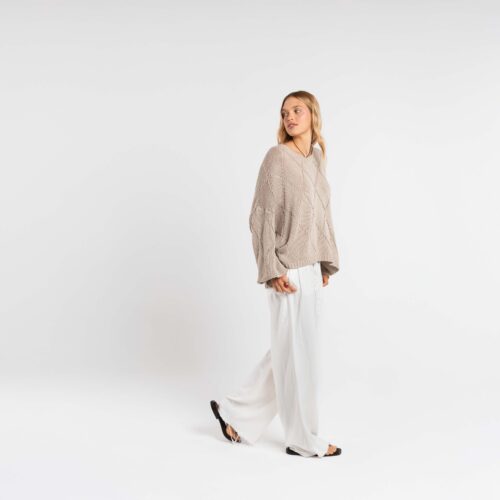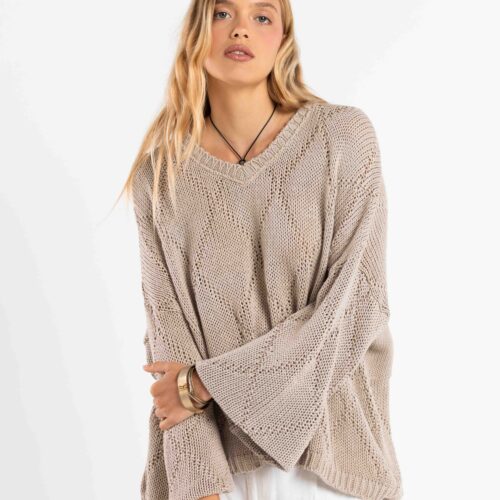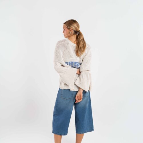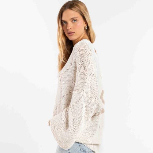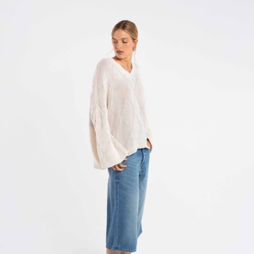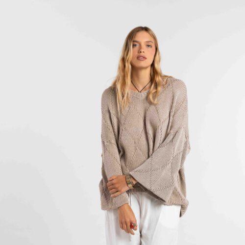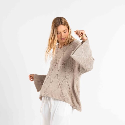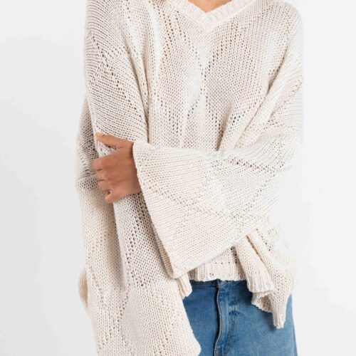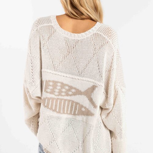 Tejido en maquina haciendo rombos calados y dibujos peces . Amplio y escote en V