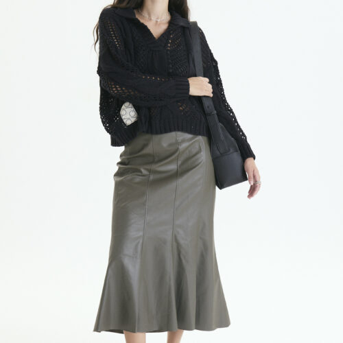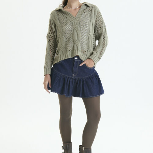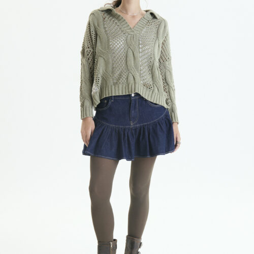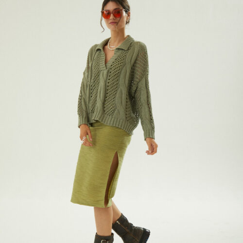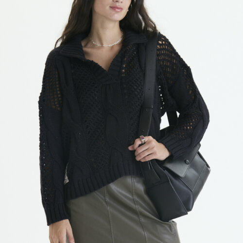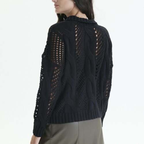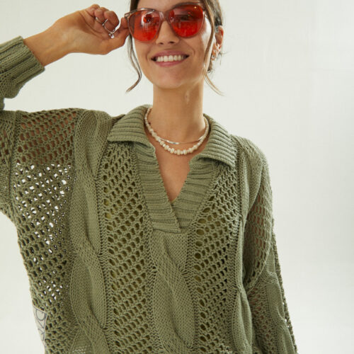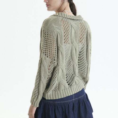 Es un sweater amplio , puntos calados y con aranes , y cuello polo abierto